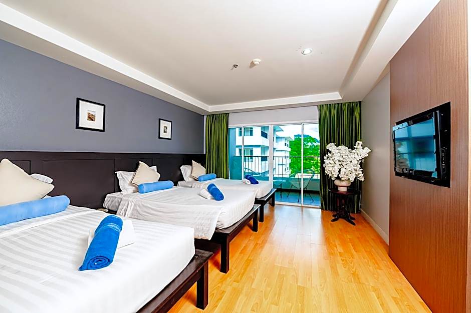 The spacious quadruple room features air conditioning, a seating area, a balcony with pool views as well as a private bathroom boasting a shower. The unit has 3 beds.